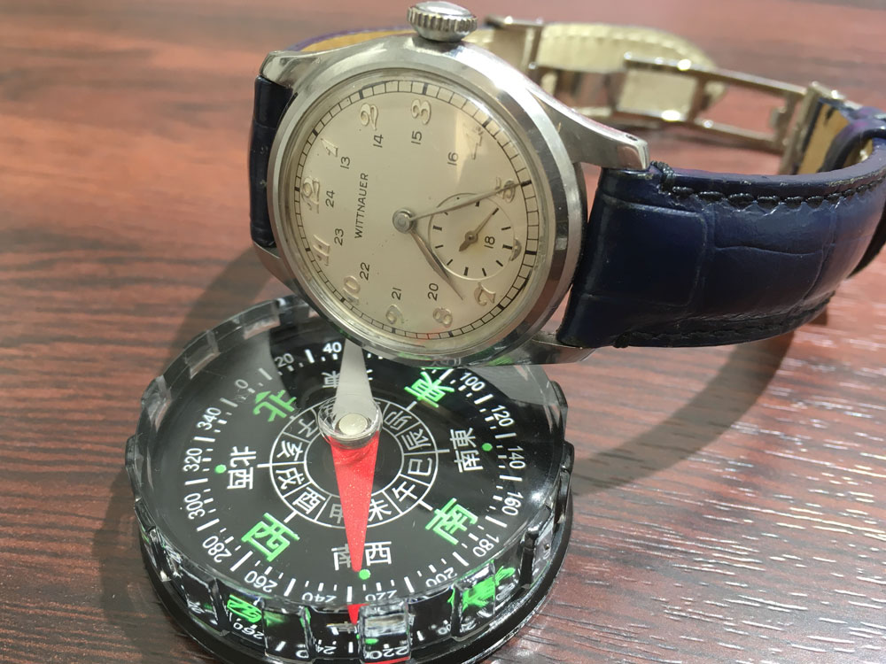 個人でも簡易的に磁気帯びの有無を確認する方法として「方位磁針(コンパス)」を使ったチェックがあります。時計を近づけて方位磁針の針が不自然に動けば、磁気帯びしている可能性が高いと考えられます。