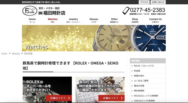 前橋市の中心、「沼田時計店」は公式Wixサイトにてロレックス・オメガなど高級ブランドの修理を明示。クォーツ20,000円〜、機械式45,000円〜、スピードマスター60,000円〜と詳細価格も記されています。現行品だけでなくアンティーク対応実績があり、郵送受付も対応。中央前橋駅徒歩2〜3分、駐車場完備。Googleでは「丁寧で親切」「納期通り」と高評価です。