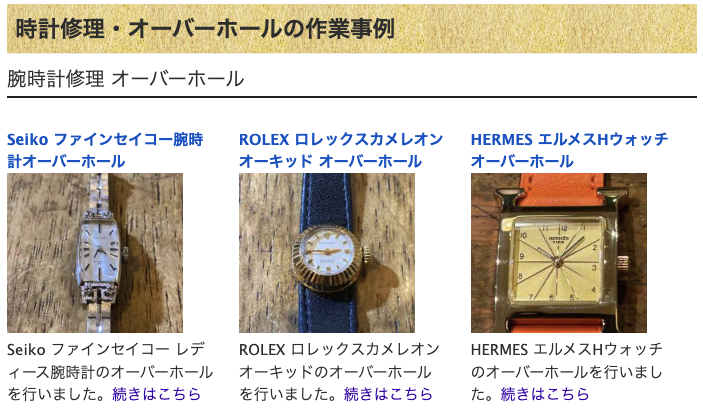 | 修理対象(対応ブランド) | ロレックス、オメガ、IWC、パテックフィリップ、カルティエ、ブルガリ、セイコーなど国内外高級ブランドの腕時計・懐中時計・掛時計・柱時計など各種修理対応 |