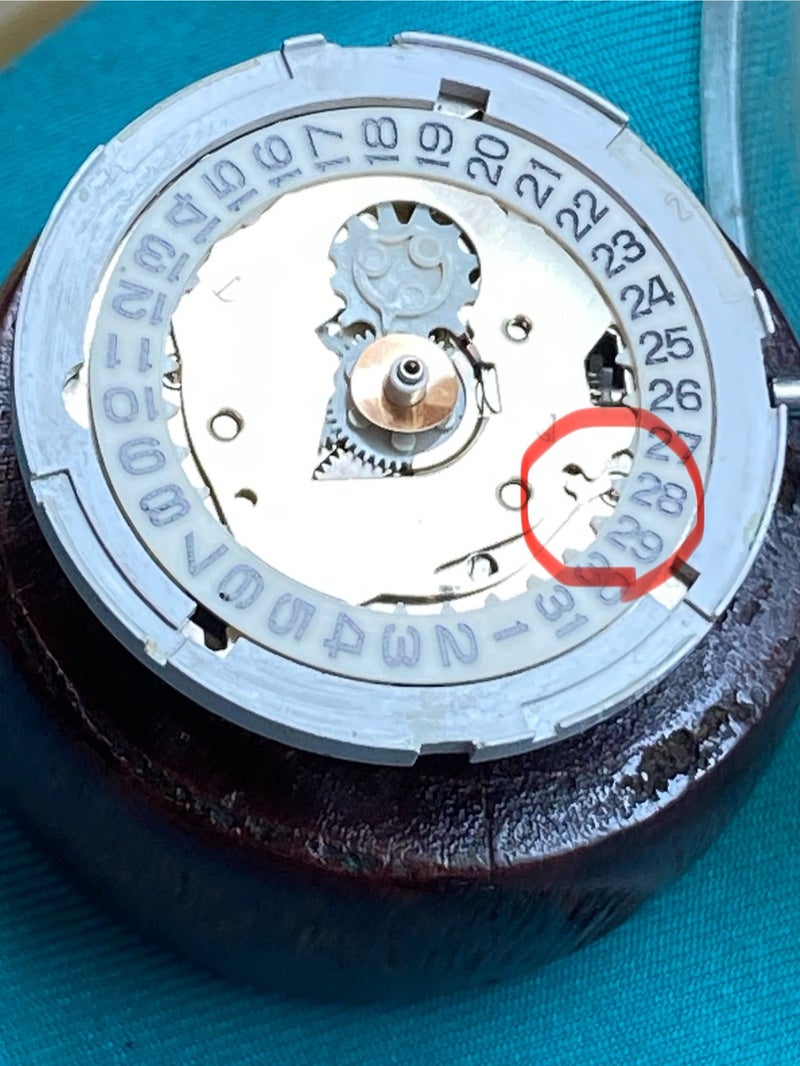 カレンダーが通常位置に止まらない不具合に対して裏側を分解し、位置決めバネがカレンダープレートの山部に噛み込んでいるのを発見、動きが重くなる原因として劣化したプラスチック製リングの摩耗を想定して文字盤側に接着固定し、カレンダー送り歯の構造も確認したうえで注油処置を加え、写真とともに工程・原因・処置が明快に記録されており、職人の分析と精度へのこだわりが伝わる内容です。