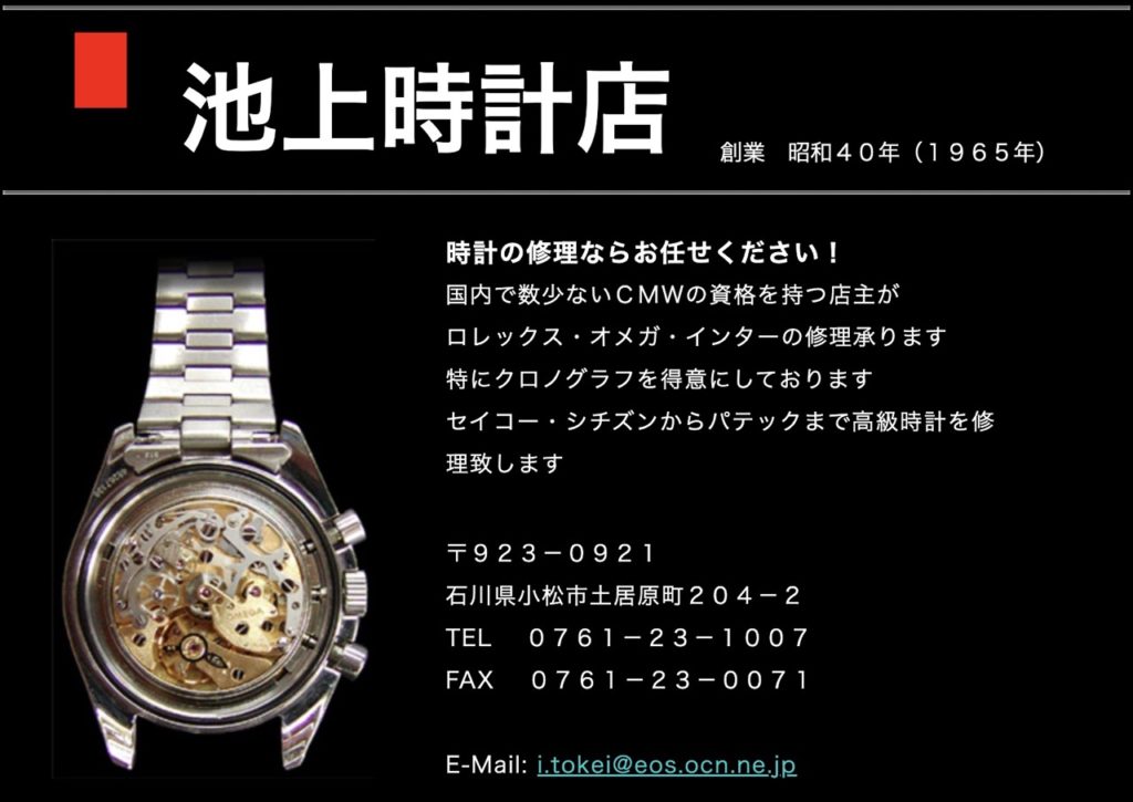 池上時計店は石川県小松市に所在する、1970年代に創業された歴史ある時計修理専門店です。店舗には日本で数百人ほどしかいないCMW資格を持つ技術者が常駐し、機械式・クォーツ式を問わずロレックスやオメガ、インターナショナルなど高級ブランドのクロノグラフ修理に強みを持っています。JR小松駅から徒歩約2分の駅近立地で、地元顧客にも気軽に相談できる環境が整っています。修理事例を含む第三者サイトでは、オーバーホールや分解掃除に加え、部品交換まで幅広く対応している記載があり、技術面での信頼度が高いです。口コミでは、「昔の懐中時計も直してくれた」「作業前に丁寧な説明があり安心できた」といった具体的な評価が多く、職人の信頼性と説明力に対する支持が伺えます。